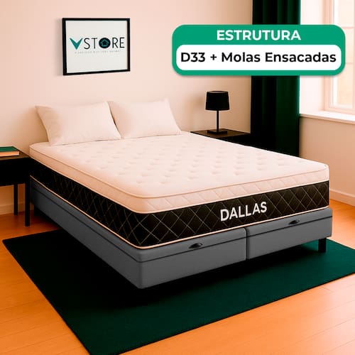 A tecnologia que a sua casa merece está na V-Store! O Conjunto Colchão Dallas e Base Box Baú Bravus combina conforto e praticidade. O colchão, com molas ensacadas, espuma D33, Euro Pillow e tecnologia EPS, oferece suporte ideal, conforto térmico, maior durabilidade e resistência. A base box baú, com estrutura reforçada e acabamento elegante, proporciona amplo espaço para armazenamento e organização do dormitório. Perfeito para quem busca qualidade, funcionalidade e sofisticação. Adquira agora e transforme suas noites de sono! Característica Do Colchão: Modelo: DallasMarca: V-StoreTamanho: KingDimensões: 193x20x203 (Largura x Altura x Comprimento)Conforto: MédioSistema: Molas EnsacadasPillow: Euro PillowPeso Máximo recomendado: 150 kg (Por pessoa)Proteções: Antiácaro, antialérgico, antifungo, antimofoGarantia: 12 Meses (Espuma) / 10 anos ( Conjunto de Molas Ensacadas)Característica Da Base: Marca: V-StoreModelo: BravusTamanho: KingDimensões: 193x44x203 (Largura x Altura x Comprimento)Estrutura: MadeiraPeso máximo recomendado: 150 kg (Por Pessoa)Altura do Box: 38 cmAltura dos Pés: 6 cmAltura total: 44 cmGarantia: 12 Meses (Estrutura) / 3 meses (Tecido)Selo Ecologicamente CorretoAtenção:- Antes de finalizar sua compra, recomendamos que verifique se as dimensões do produto são adequadas para serem transportadas pelos elevadores, portas, escadas e corredores de sua residência. Ressaltamos que não nos responsabilizamos pelo transporte do produto por meios específicos, como escadas, guinchos ou içamentos.- É possível que hajam leves variações de cor de acordo com o dispositivo que está sendo utilizado como smartphones, computadores, monitores e outros.