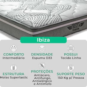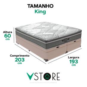 A tecnologia que a sua casa merece está na V-Store! O colchão Ibiza combina Molas Ensacadas, espuma de alta performance e sistema EPS, oferecendo suporte, conforto térmico e design moderno para noites revigorantes. Já a Base Box Baú Bravus une funcionalidade e elegância, com estrutura resistente, revestimento em tecido sintético e amplo espaço para armazenamento, ideal para otimizar o quarto com estilo..Característica Do Colchão: Modelo: IbizaMarca: V-StoreTamanho: KingDimensões: 193x22x203 (Largura x Altura x Comprimento)Conforto: intermediárioSistema: Molas EnsacadasPillow: Não se aplicaPeso Máximo recomendado: 150 kg (Por pessoa)Proteções: Antiácaro, antialérgico, antifungo, antimofoGarantia: 12 Meses (Espuma) / 10 anos ( Conjunto de Molas Ensacadas)Característica Da Base: Marca: V-StoreModelo: BravusTamanho: KingDimensões: 193x44x203 (Largura x Altura x Comprimento)Estrutura: MadeiraPeso máximo recomendado: 150 kg (Por Pessoa)Altura do Box: 38 cmAltura dos Pés: 6 cmAltura total: 44 cmGarantia: 12 Meses (Estrutura) / 3 meses (Tecido)Selo Ecologicamente CorretoAtenção:- Antes de finalizar sua compra, recomendamos que verifique se as dimensões do produto são adequadas para serem transportadas pelos elevadores, portas, escadas e corredores de sua residência. Ressaltamos que não nos responsabilizamos pelo transporte do produto por meios específicos, como escadas, guinchos ou içamentos.- É possível que hajam leves variações de cor de acordo com o dispositivo que está sendo utilizado como smartphones, computadores, monitores e outros.