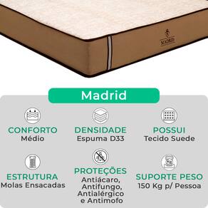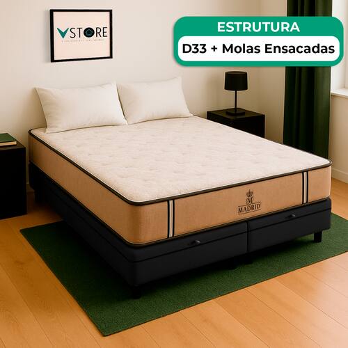 A tecnologia que a sua casa merece está na V-Store! O Conjunto Colchão Madrid + Base Box Baú Bravus da V-Store oferece o equilíbrio perfeito entre conforto, praticidade e elegância. O colchão, com molas ensacadas e sistema EPS, garante noites de sono tranquilas, com suporte ideal e proteção contra ácaros e alergias. Já a base box baú, feita com madeira reflorestada, conta com um design sofisticado, amplo espaço de armazenamento e funcionalidade adicional para guardar travesseiros, malas e cobertores. Com capacidade para até 150 kg por pessoa, esse conjunto é ideal para quem busca qualidade e praticidade.Característica Do Colchão: Modelo: MadridMarca: V-StoreTamanho: KingDimensões: 193x28x203 (Largura x Altura x Comprimento)Conforto: MédioSistema: Molas EnsacadasPillow: Não se aplicaPeso Máximo recomendado: 150 kg (Por pessoa)Proteções: Antiácaro, antialérgico, antifungo, antimofoGarantia: 12 Meses (Espuma) / 10 anos ( Conjunto de Molas Ensacadas)Característica Da Base: Marca: V-StoreModelo: BravusTamanho: KingDimensões: 193x44x203 (Largura x Altura x Comprimento)Estrutura: MadeiraPeso máximo recomendado: 150 kg (Por Pessoa)Altura do Box: 38 cmAltura dos Pés: 6 cmAltura total: 44 cmGarantia: 12 Meses (Estrutura) / 3 meses (Tecido)Selo Ecologicamente CorretoAtenção:- Antes de finalizar sua compra, recomendamos que verifique se as dimensões do produto são adequadas para serem transportadas pelos elevadores, portas, escadas e corredores de sua residência. Ressaltamos que não nos responsabilizamos pelo transporte do produto por meios específicos, como escadas, guinchos ou içamentos.- É possível que hajam leves variações de cor de acordo com o dispositivo que está sendo utilizado como smartphones, computadores, monitores e outros.