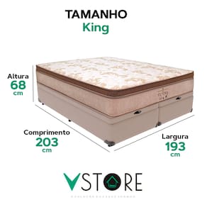 A tecnologia que a sua casa merece está na V-Store! O colchão Victory Solteiro da V-Store oferece noites de sono tranquilas e confortáveis, com seu toque macio e sistema de molas ensacadas que garantem suporte ideal e independência de movimentos. O Pillow Euro Pillow proporciona ainda mais suavidade, enquanto a tecnologia EPS adiciona resistência e durabilidade. Com proteções contra ácaros, fungos, mofo e alergias, ele garante um ambiente de sono saudável. Suporta até 150 kg por pessoa e tem garantia de 12 meses.A Base Box Baú Bravus da V-Store combina praticidade e sofisticação, com madeira reflorestada e revestimento sintético que facilitam a manutenção. Seu design otimiza o espaço de armazenamento e oferece resistência, suportando até 150 kg por pessoa. Com 44 cm de altura total e Selo Ecologicamente Correto, ela é ideal para quem busca sustentabilidade e qualidade. Transforme seu quarto com o colchão Victory e a Base Box Baú Bravus da V-Store!Característica Do Colchão: Modelo: VictoryMarca: V-StoreTamanho: KingDimensões: 193x30x203 (Largura x Altura x Comprimento)Conforto: MédioSistema: Molas EnsacadasPillow: Euro PillowPeso Máximo recomendado: 150 kg (Por pessoa)Proteções: Antiácaro, antialérgico, antifungo, antimofoGarantia: 12 Meses (Espuma) / 10 anos ( Conjunto de Molas Ensacadas)Característica Da Base: Marca: V-StoreModelo: BravusTamanho: KingDimensões: 193x44x203 (Largura x Altura x Comprimento)Estrutura: MadeiraPeso máximo recomendado: 150 kg (Por Pessoa)Altura do Box: 38 cmAltura dos Pés: 6 cmAltura total: 44 cmGarantia: 12 Meses (Estrutura) / 3 meses (Tecido)Selo Ecologicamente CorretoAtenção:- Antes de finalizar sua compra, recomendamos que verifique se as dimensões do produto são adequadas para serem transportadas pelos elevadores, portas, escadas e corredores de sua residência. Ressaltamos que não nos responsabilizamos pelo transporte do produto por meios específicos, como escadas, guinchos ou içamentos.- É possível que hajam leves variações de cor de acordo com o dispositivo que está sendo utilizado como smartphones, computadores, monitores e outros.