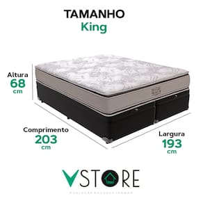 A tecnologia que a sua casa merece está na V-Store! O Conjunto Colchão Four Seasons e Base Box Baú Bravus é a solução ideal para quem busca conforto, durabilidade e praticidade. O colchão, com molas ensacadas, pillow top e tecnologia EPS, oferece suporte independente e conforto térmico, enquanto o revestimento em malha 100% algodão e tratamentos antiácaro e antialérgico garantem mais saúde e bem-estar. A Base Box Baú Bravus, feita com madeira reflorestada e revestida com tecido sintético, combina resistência, elegância e funcionalidade, oferecendo um excelente espaço de armazenamento e otimizando o seu quarto.Característica Do Colchão: Modelo: Four SeasonMarca: V-StoreTamanho: KingDimensões: 193x30x203 (Largura x Altura x Comprimento)Conforto: MédioSistema: Molas EnsacadasPillow: Pillow TopPeso Máximo recomendado: 150 kg (Por pessoa)Proteções: Antiácaro, antialérgico, antifungo, antimofoGarantia: 12 Meses (Espuma) / 10 anos ( Conjunto de Molas Ensacadas)Característica Da Base: Marca: V-StoreModelo: BravusCor do Box: PretoTamanho: KingDimensões: 193x44x203 (Largura x Altura x Comprimento)Estrutura: MadeiraPeso máximo recomendado: 150 kg (Por Pessoa)Altura do Box: 38 cmAltura dos Pés: 6 cmAltura total: 44 cmGarantia: 12 Meses (Estrutura) / 3 meses (Tecido)Selo Ecologicamente CorretoAtenção:- Antes de finalizar sua compra, recomendamos que verifique se as dimensões do produto são adequadas para serem transportadas pelos elevadores, portas, escadas e corredores de sua residência. Ressaltamos que não nos responsabilizamos pelo transporte do produto por meios específicos, como escadas, guinchos ou içamentos.- É possível que hajam leves variações de cor de acordo com o dispositivo que está sendo utilizado como smartphones, computadores, monitores e outros.
