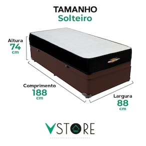 A tecnologia que a sua casa merece está na V-Store! O Conjunto Colchão Orthopedic + Base Box Baú Bravus da V-Store une conforto e funcionalidade. O colchão, com espuma D33 e suporte extra firme, oferece alinhamento ideal e proteção contra ácaros, alergias e fungos. A base box baú, com estrutura resistente e espaço interno, combina organização e estilo, otimizando seu dormitório com praticidade e elegância.Característica Do Colchão: Modelo: OrthopedicMarca: V-StoreTamanho: SolteiroDimensões: 88x30x188 (Largura x Altura x Comprimento)Conforto: Extra FirmeSistema: EspumaPillow: Não se aplicaPeso Máximo recomendado: 110 kg (Por pessoa)Proteções: Antiácaro, antialérgico, antifungo, antimofoGarantia: 12 Meses (Espuma)Característica Da Base: Marca: V-StoreModelo: BravusCor do Box: MarromTamanho: SolteiroDimensões: 88x44x188 (Largura x Altura x Comprimento)Estrutura: MadeiraPeso máximo recomendado: 150 kg (Por Pessoa)Altura do Box: 38 cmAltura dos Pés: 6 cmAltura total: 44 cmGarantia: 12 Meses (Estrutura) / 3 meses (Tecido)Selo Ecologicamente CorretoAtenção:- Antes de finalizar sua compra, recomendamos que verifique se as dimensões do produto são adequadas para serem transportadas pelos elevadores, portas, escadas e corredores de sua residência. Ressaltamos que não nos responsabilizamos pelo transporte do produto por meios específicos, como escadas, guinchos ou içamentos.- É possível que hajam leves variações de cor de acordo com o dispositivo que está sendo utilizado como smartphones, computadores, monitores e outros.