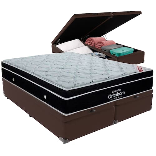 O conforto que sua casa precisa e a qualidade que você merece está na Kazamix!Desfrute do máximo conforto com o Colchão Elegant Ortobom! Sua estrutura de molas ensacadas, combinada com espuma D26 de alta densidade, proporciona o suporte perfeito para uma noite de sono revigorante. O Pillow Euro oferece um toque adicional de suavidade, garantindo um descanso ainda mais relaxante.Com o sistema No Turn, a manutenção se torna super simples, pois não é necessário virar o colchão. A fibra de bambu, que possui um toque macio e aconchegante, também contribui para um ambiente mais sustentável e confortável.Experimente o Colchão Elegant Ortobom e descubra o conforto, a qualidade e a inovação que você merece. Invista em noites de sono incríveis!Modelo: ElegantMarca: OrtobomTamanho: QueenDimensões: 158x198X28 (Largura x Comprimento x Altura)Conforto: FirmeSistema: Molas EnsacadasPillow: Euro PillowPeso Máximo recomendado: 150 kg (Por pessoa)Proteções: Antiácaro, antialérgico, antifungo, antimofoGarantia: 1 ano pelo FabricanteO conforto que sua casa precisa e a qualidade que você merece está na KazamixAproveite cada metro quadrado do seu dormitório com a Cama Box Baú!Projetada com madeira de reflorestamento reforçada, a Cama Box Baú é a escolha ideal para quem busca otimização de espaço e praticidade na organização do dia a dia.Com um baú generoso, ela oferece a solução perfeita para armazenar travesseiros extras, cobertores, malas e muito mais. Além disso, sua estrutura robusta suporta até 150 kg por pessoa, garantindo a sustentação ideal para o seu colchão e prolongando sua vida útil.O pistão a gás robusto proporciona uma abertura suave e segura do baú, oferecendo praticidade e resistência no uso diário. Para completar, o acabamento de alta qualidade combina perfeitamente com qualquer estilo de decoração, agregando elegância e versatilidade ao seu ambiente.Não perca tempo! Adquira agora mesmo sua Cama Box Baú e diga adeus à falta de espaço e desorganização.Marca: KazaMixModelo: BaúCor do Box: MarromTamanho: QueenDimensões: 158X198X37 (Largura x Comprimento x Altura) Estrutura: MadeiraPeso máximo recomendado: 150 kg (Por Pessoa)Altura do Box: 32 cm Altura dos Pés: 5 cm Altura total: 37 cm Garantia: 03 mesesSelo Ecologicamente CorretoAtenção: Antes de finalizar sua compra, certifique-se de que as dimensões do produto sejam adequadas para serem transportadas pelos elevadores, portas, escadas e corredores de sua residência. Ressaltamos que não nos responsabilizamos pelo transporte do produto por meios específicos, como escadas, guinchos ou içamentos.