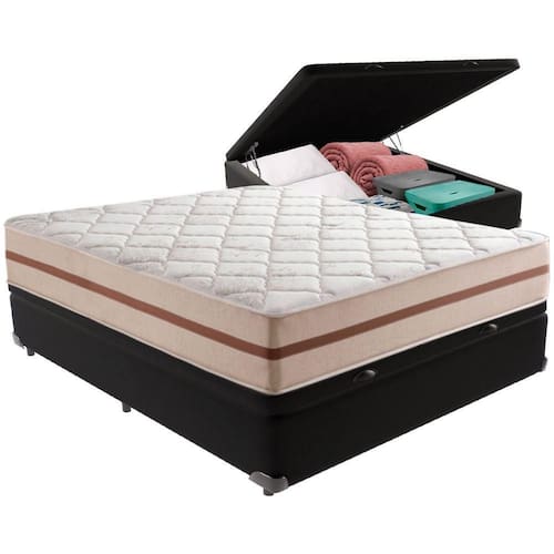 Com um baú generoso, ela oferece a solução perfeita para armazenar travesseiros extras, cobertores, malas e muito mais. Além disso, sua estrutura robusta suporta até 150 kg por pessoa, garantindo a sustentação ideal para o seu colchão e prolongando sua vida útil.