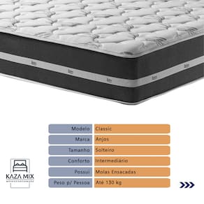 O conforto que sua casa precisa e a qualidade que você merece está na Kazamix!Descubra o Colchão Classic da Anjos, a combinação perfeita de funcionalidade, conforto e durabilidade. Com design clean e moderno, sua superfície plana proporciona um toque de elegância ao ambiente, enquanto as molas ensacadas garantem um suporte individualizado, ideal para um descanso tranquilo e sem transferência de movimento.Este modelo oferece conforto intermediário, adaptando-se às mais variadas preferências. Com tratamento antiácaro e antialérgico, o Classic cria um ambiente mais saudável e seguro para o seu sono. Um colchão de alta densidade que une qualidade e custo-benefício, perfeito para quem valoriza bem-estar e sofisticação. Transforme suas noites com o conforto que você merece!Modelo: Classic 26 PretoMarca: AnjosTamanho: SolteiroDimensões: 88x188X26 (Largura x Comprimento x Altura)Conforto: IntermediárioSistema: Molas ensacadas Pillow: Não se AplicaPeso Máximo recomendado: 130 kg (Por pessoa)Proteções: Antiácaro, antialérgico, antifungo, antimofoGarantia: 1 ano pelo FabricanteO conforto que sua casa precisa e a qualidade que você merece está na KazamixAproveite cada metro quadrado do seu dormitório com a Cama Box Baú!Projetada com madeira de reflorestamento reforçada, a Cama Box Baú é a escolha ideal para quem busca otimização de espaço e praticidade na organização do dia a dia.Com um baú generoso, ela oferece a solução perfeita para armazenar travesseiros extras, cobertores, malas e muito mais. Além disso, sua estrutura robusta suporta até 150 kg por pessoa, garantindo a sustentação ideal para o seu colchão e prolongando sua vida útil.O pistão a gás robusto proporciona uma abertura suave e segura do baú, oferecendo praticidade e resistência no uso diário. Para completar, o acabamento de alta qualidade combina perfeitamente com qualquer estilo de decoração, agregando elegância e versatilidade ao seu ambiente.Não perca tempo! Adquira agora mesmo sua Cama Box Baú e diga adeus à falta de espaço e desorganização.Marca: KazaMixModelo: BaúCor do Box: PretoTamanho: SolteiroDimensões: 88X188X37 (Largura x Comprimento x Altura) Estrutura: MadeiraPeso máximo recomendado: 150 kg (Por Pessoa)Altura do Box: 32 cm Altura dos Pés: 5 cm Altura total: 37 cm Garantia: 03 mesesSelo Ecologicamente CorretoAtenção: Antes de finalizar sua compra, certifique-se de que as dimensões do produto sejam adequadas para serem transportadas pelos elevadores, portas, escadas e corredores de sua residência. Ressaltamos que não nos responsabilizamos pelo transporte do produto por meios específicos, como escadas, guinchos ou içamentos.