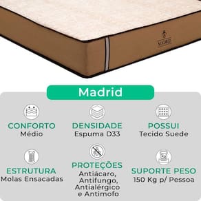 O Conjunto Colchão Madrid + Base Box Baú Bravus da V-Store oferece o equilíbrio perfeito entre conforto, praticidade e elegância. O colchão, com molas ensacadas e sistema EPS, garante noites de sono tranquilas, com suporte ideal e proteção contra ácaros e alergias. Já a base box baú, feita com madeira reflorestada, conta com um design sofisticado, amplo espaço de armazenamento e funcionalidade adicional para guardar travesseiros, malas e cobertores. Com capacidade para até 150 kg por pessoa, esse conjunto é ideal para quem busca qualidade e praticidade.