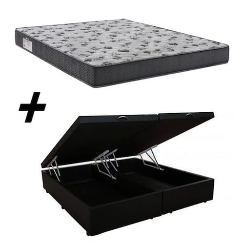 Cama Box Baú Queen Bipartido Corino Preto + Colchão Iso 100 D33 158x198x18 - Ortobom