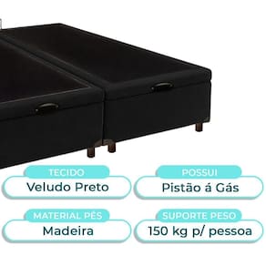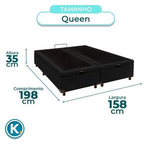 Modelo: Elite Marca: Nature Tamanho: Queen Tecido: Veludo Largura: 158cm Comprimento: 198cm Altura: 35cm Altura dos Pés: 7cm Material dos Pés: Madeira Suporte de Peso: 150Kg Peso: 40Kg Garantia: 3 Meses