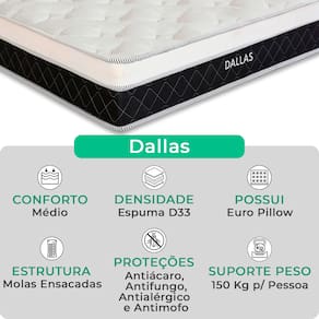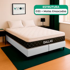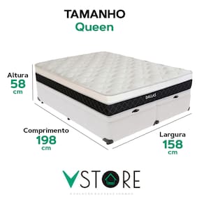 A tecnologia que a sua casa merece está na V-Store! O Conjunto Colchão Dallas e Base Box Baú Bravus combina conforto e praticidade. O colchão, com molas ensacadas, espuma D33, Euro Pillow e tecnologia EPS, oferece suporte ideal, conforto térmico, maior durabilidade e resistência. A base box baú, com estrutura reforçada e acabamento elegante, proporciona amplo espaço para armazenamento e organização do dormitório. Perfeito para quem busca qualidade, funcionalidade e sofisticação. Adquira agora e transforme suas noites de sono! Característica Do Colchão: Modelo: DallasMarca: V-StoreTamanho: QueenDimensões: 158x20x198 (Largura x Altura x Comprimento)Conforto: MédioSistema: Molas EnsacadasPillow: Euro PillowPeso Máximo recomendado: 150 kg (Por pessoa)Proteções: Antiácaro, antialérgico, antifungo, antimofoGarantia: 12 Meses (Espuma) / 10 anos ( Conjunto de Molas Ensacadas)Característica Da Base: Marca: V-StoreModelo: BravusCor do Box: BrancoTamanho: QueenDimensões: 158x44x198 (Largura x Altura x Comprimento)Estrutura: MadeiraPeso máximo recomendado: 150 kg (Por Pessoa)Altura do Box: 38 cmAltura dos Pés: 6 cmAltura total: 44 cmGarantia: 12 Meses (Estrutura) / 3 meses (Tecido)Selo Ecologicamente CorretoAtenção:- Antes de finalizar sua compra, recomendamos que verifique se as dimensões do produto são adequadas para serem transportadas pelos elevadores, portas, escadas e corredores de sua residência. Ressaltamos que não nos responsabilizamos pelo transporte do produto por meios específicos, como escadas, guinchos ou içamentos.- É possível que hajam leves variações de cor de acordo com o dispositivo que está sendo utilizado como smartphones, computadores, monitores e outros.