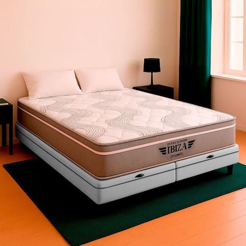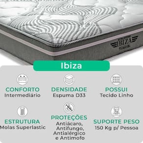 O colchão Ibiza combina Molas Ensacadas, espuma de alta performance e sistema EPS, oferecendo suporte, conforto térmico e design moderno para noites revigorantes. Já a Base Box Baú Bravus une funcionalidade e elegância, com estrutura resistente, revestimento em tecido sintético e amplo espaço para armazenamento, ideal para otimizar o quarto com estilo..