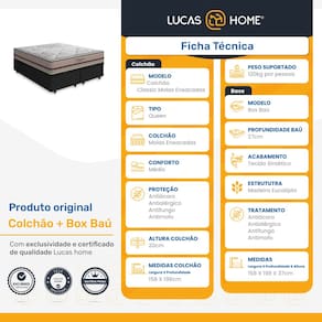 Sejam bem-vindos (as) a LUCAS HOME, o Conjunto Cama Box com Baú + Colchão de Molas Ensacadas - Anjos - Classic é uma combinação exclusiva da Lucas Home que oferece uma solução completa na aquisição de sua nova cama. O Colchão de Molas Ensacadas - Anjos - Classic é indicado para pessoas de até 120kg proporcionando conforto macio, o que lhe confere conforto extra durante o sono sem comprometer sua coluna. A base baú é confeccionada com madeira de reflorestamento, possuindo tratamentos anticupim e antimofo, com acabamento em material Sintético de alta qualidade. O seu diferencial é seu compartimento interno garantindo um novo espaço em seu quarto agregando valor e sofisticação ao ambiente.