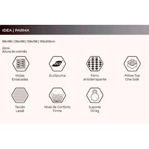 Dimensões(Cm): Comprimento(Profundidade): 198cm x Largura: 158cm x Altura: 22cm Tipo de Colchão - Molas Vantagens Extras de Colchão - Ecologicamente Correto Tipo de Pillow - Pillow Top Americano Tecido com Tratamento do Colchão - AntiÁcaro e AntiFungo Forração Revestimento do Colchão - Malha de Alta Qualidade Forração do Revestimento Inferior do Colchão - Antiderrapante Modo de Utilização do Colchão - One Side Tipo de Mola do Colchão - Ensacadas Nível de Firmeza do Colchão - Firme Peso Máximo Suportado do Colchão - 110 kg Certificação de Qualidade do Colchão - Qualidade Aprovada - INMETRO Tempo de Garantia do Colchão - 3 meses