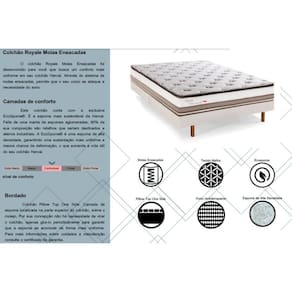 Dimensões(Cm): Comprimento(Profundidade): 198cm x Largura: 158cm x Altura: 29cm Tipo de Colchão - Molas Vantagens Extras de Colchão - Ecologicamente Correto - c/ Sistema Polyframe Tipo de Pillow - Pillow Top Americano Tecido com Tratamento do Colchão - AntiÁcaro e AntiFungo Bordado do Revestimento do Colchão - Localizado Forração Revestimento do Colchão - Poliéster Forração do Revestimento Inferior do Colchão - Antiderrapante Tecido de Revestimento da Faixa Lateral do Colchão - Poliéster Modo de Utilização do Colchão - One Side Camadas Interna do Estofamento de Espuma do Colchão - AG Densidade da Espuma do Colchão - 20 Tipo de Mola do Colchão - Ensacadas Molas Ensacadas Nível de Firmeza do Colchão - Macio c/ Firmeza Peso Máximo Suportado do Colchão - 120 kg Certificação de Qualidade do Colchão - Qualidade Aprovada - Qualidade Costa Rica - Selo Abicol Nossa Avaliação do Colchão - Qualidade Boa