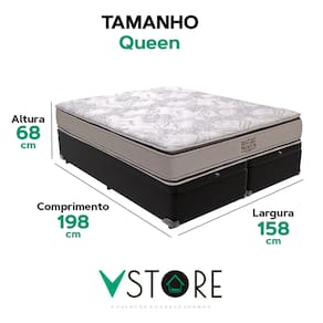 A tecnologia que a sua casa merece está na V-Store! O Conjunto Colchão Four Seasons e Base Box Baú Bravus é a solução ideal para quem busca conforto, durabilidade e praticidade. O colchão, com molas ensacadas, pillow top e tecnologia EPS, oferece suporte independente e conforto térmico, enquanto o revestimento em malha 100% algodão e tratamentos antiácaro e antialérgico garantem mais saúde e bem-estar. A Base Box Baú Bravus, feita com madeira reflorestada e revestida com tecido sintético, combina resistência, elegância e funcionalidade, oferecendo um excelente espaço de armazenamento e otimizando o seu quarto.Característica Do Colchão: Modelo: Four SeasonMarca: V-StoreTamanho: QueenDimensões: 158x30x198 (Largura x Altura x Comprimento)Conforto: MédioSistema: Molas EnsacadasPillow: Pillow TopPeso Máximo recomendado: 150 kg (Por pessoa)Proteções: Antiácaro, antialérgico, antifungo, antimofoGarantia: 12 Meses (Espuma) / 10 anos ( Conjunto de Molas Ensacadas)Característica Da Base: Marca: V-StoreModelo: BravusCor do Box: PretoTamanho: QueenDimensões: 158x44x198 (Largura x Altura x Comprimento)Estrutura: MadeiraPeso máximo recomendado: 150 kg (Por Pessoa)Altura do Box: 38 cmAltura dos Pés: 6 cmAltura total: 44 cmGarantia: 12 Meses (Estrutura) / 3 meses (Tecido)Selo Ecologicamente CorretoAtenção:- Antes de finalizar sua compra, recomendamos que verifique se as dimensões do produto são adequadas para serem transportadas pelos elevadores, portas, escadas e corredores de sua residência. Ressaltamos que não nos responsabilizamos pelo transporte do produto por meios específicos, como escadas, guinchos ou içamentos.- É possível que hajam leves variações de cor de acordo com o dispositivo que está sendo utilizado como smartphones, computadores, monitores e outros.