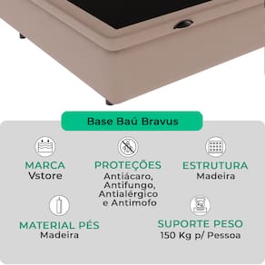 A tecnologia que a sua casa merece está na V-Store!A Base Box Baú Bravus da V-Store combina praticidade e elegância, sendo a escolha perfeita para quem busca organização e estilo. Feita com madeira reflorestada e revestida com tecido sintético, ela oferece resistência e facilidade de manutenção, além de proporcionar um excelente espaço de armazenamento para travesseiros, malas e cobertores.Com capacidade para 150 kg por pessoa e Selo Ecologicamente Correto, essa base é ideal para otimizar seu espaço sem abrir mão da sustentabilidade.Adquira já a sua Base Box Baú Bravus V-Store e transforme seu dormitório com praticidade e sofisticação!CARACTERÍSTICAS DO PRODUTOMarca: V-StoreModelo: BravusEstrutura: MadeiraPeso máximo recomendado: 150 kg (Por Pessoa)Altura do Box: 38 cmAltura dos Pés: 6 cmAltura total: 44 cmGarantia: 12 Meses (Estrutura) / 3 meses (Tecido)Selo Ecologicamente CorretoAtenção:- Antes de finalizar sua compra, recomendamos que verifique se as dimensões do produto são adequadas para serem transportadas pelos elevadores, portas, escadas e corredores de sua residência. Ressaltamos que não nos responsabilizamos pelo transporte do produto por meios específicos, como escadas, guinchos ou içamentos.- É possível que hajam leves variações de cor de acordo com o dispositivo que está sendo utilizado como smartphones, computadores, monitores e outros.