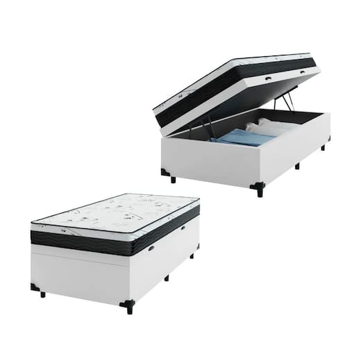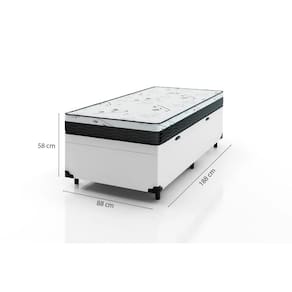Cama Box Baú Solteiro 88 com Colchão Espuma D33 One Face PretoO colchão One Face é compostos por poliestireno expandido ( EPS) que juntamente com a espuma de Densidade D33 são responsáveis por toda a sustentação do peso. Eles são indicados para aqueles que sentem dores nas costas em relação aos outros tipos de colchões no Mercado. Famoso pela durabilidade, também suportam mais pesos e são recomendadas para aqueles que procuram um colchão com mais firmeza. Já a cama baú é uma ótima opção para quem busca praticidade e economia de espaço, podendo guardar cobertores, jogos de cama, travesseiros.Informações do Colchão: 1. Tecido de revestimento: Poliéster Bordado; 2. Cor: Branco c/ Preto; 3. Modelo: One Face (uma face); 4. Tamanho: Altura: 17 cm, Largura: 88 cm, Comprimento: 188 cm. 5. Peso limite: 120 kg por pessoa. 6. Peso do produto: 4,6 kg 7. Material de estrutura: Espuma D33 e EPS. 8. Tipo de conforto: Intermediário Firme. 9. Garantia: 3 meses. 10. Marca: Bello Box.Especificações Técnicas Baú:- Material: Madeira tratada. - Proteções: Antiácaro - Antialérgico - Antifungo – Antimofo. - Peso máximo recomendado: até 100kg (por pessoa). - Altura do baú: 41cm (35cm c/ 6cm dos pés).- Revestimento: Tecido Sintético.- Cor: Branco.- Marca: Bello Box.- Quantidade de Pés: 6 pés.- Material dos pés: plástico.- Garantia: 3 meses. - Dimensões do produto (altura x largura x comprimento) Solteiro: 41x88x188cm. Importante:- As imagens ambientadas são meramente ilustrativas e podem apresentar itens que não compõe o produto;- As cores do produto podem variar de acordo com o monitor, a iluminação do ambiente ou sua percepção visual;- Não nos responsabilizamos em subir pelas escadas ou içar o produto.- Montagens, desmontagens e instalações são responsabilidades do cliente. Estes serviços não estão inclusos no valor do produto. Para evitar imprevistos na sua entrega, confira as dimensões do produto no momento da compra e certifique-se de que ele passará por elevadores, portas, escadas e corredores.