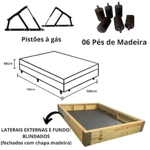 Acompanha: 02 PISTÕES A GÁS - amortecedores pneumáticos que possibilitam o manuseio do baú, o mantendo aberto durante a sua utilização. Puxador utilizado para facilitar a abertura e o fechamento do box baú (já montado). 06 pezinhos de madeira com 6cm de altura aprox.- resistentes e ideias para suportar o peso Cantoneiras
