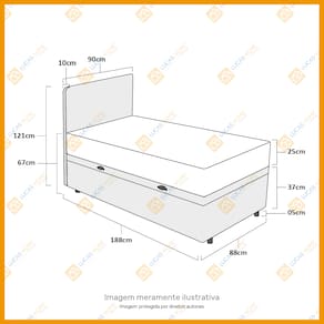 Especificações Técnicas Baú: - Marca: Lucas Home; - Material: Madeira tratada; - Peso máximo recomendado: até 150 Kg (por pessoa); - Altura do baú: 37cm; - Profundidade do baú: 27cm; - Altura dos pés: 5cm; - Revestimento da Cama: Material Sintético; - Garantia: 12 meses; - Dimensões do produto (largura x comprimento x altura) 88x188x42cm.