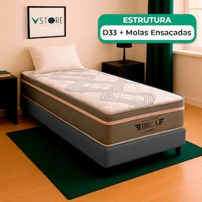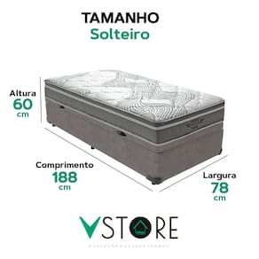 A tecnologia que a sua casa merece está na V-Store! O colchão Ibiza combina Molas Ensacadas, espuma de alta performance e sistema EPS, oferecendo suporte, conforto térmico e design moderno para noites revigorantes. Já a Base Box Baú Bravus une funcionalidade e elegância, com estrutura resistente, revestimento em tecido sintético e amplo espaço para armazenamento, ideal para otimizar o quarto com estilo..Característica Do Colchão: Modelo: IbizaMarca: V-StoreTamanho: SolteiroDimensões: 88x22x188 (Largura x Altura x Comprimento)Conforto: intermediárioSistema: Molas EnsacadasPillow: Não se aplicaPeso Máximo recomendado: 150 kg (Por pessoa)Proteções: Antiácaro, antialérgico, antifungo, antimofoGarantia: 12 Meses (Espuma) / 10 anos ( Conjunto de Molas Ensacadas)Característica Da Base: Marca: V-StoreModelo: BravusCor do Box: CinzaTamanho: SolteiroDimensões: 88x44x188 (Largura x Altura x Comprimento)Estrutura: MadeiraPeso máximo recomendado: 150 kg (Por Pessoa)Altura do Box: 38 cmAltura dos Pés: 6 cmAltura total: 44 cmGarantia: 12 Meses (Estrutura) / 3 meses (Tecido)Selo Ecologicamente CorretoAtenção:- Antes de finalizar sua compra, recomendamos que verifique se as dimensões do produto são adequadas para serem transportadas pelos elevadores, portas, escadas e corredores de sua residência. Ressaltamos que não nos responsabilizamos pelo transporte do produto por meios específicos, como escadas, guinchos ou içamentos.- É possível que hajam leves variações de cor de acordo com o dispositivo que está sendo utilizado como smartphones, computadores, monitores e outros.