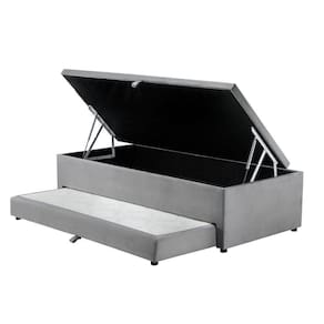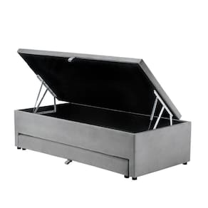 Modelo de colchão: Solteiro Para colchão de: 88 x 188 cm Matéria-prima: Madeira de Eucalipto e MDF Revestimento:: Espuma 100 poliuretano revestida com tecido 100 poliéster Tampo: Tecido Antiderrapante Levantamento do tampo: Suspenção Pneumática Cama auxiliar: Espuma D26 Respiros laterais: Sim Peso Suportado: Até 120 kg Pés: Plásticos Altura dos pés: 7 cm Sistema de montagem: É necessário fixar os pés e os pistões