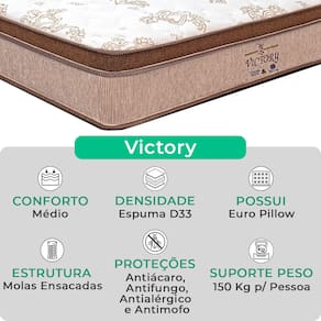 A tecnologia que a sua casa merece está na V-Store! O colchão Victory Solteiro da V-Store oferece noites de sono tranquilas e confortáveis, com seu toque macio e sistema de molas ensacadas que garantem suporte ideal e independência de movimentos. O Pillow Euro Pillow proporciona ainda mais suavidade, enquanto a tecnologia EPS adiciona resistência e durabilidade. Com proteções contra ácaros, fungos, mofo e alergias, ele garante um ambiente de sono saudável. Suporta até 150 kg por pessoa e tem garantia de 12 meses.A Base Box Baú Bravus da V-Store combina praticidade e sofisticação, com madeira reflorestada e revestimento sintético que facilitam a manutenção. Seu design otimiza o espaço de armazenamento e oferece resistência, suportando até 150 kg por pessoa. Com 44 cm de altura total e Selo Ecologicamente Correto, ela é ideal para quem busca sustentabilidade e qualidade. Transforme seu quarto com o colchão Victory e a Base Box Baú Bravus da V-Store!Característica Do Colchão: Modelo: VictoryMarca: V-StoreTamanho: SolteiroDimensões: 88x30x188 (Largura x Altura x Comprimento)Conforto: MédioSistema: Molas EnsacadasPillow: Euro PillowPeso Máximo recomendado: 150 kg (Por pessoa)Proteções: Antiácaro, antialérgico, antifungo, antimofoGarantia: 12 Meses (Espuma) / 10 anos ( Conjunto de Molas Ensacadas)Característica Da Base: Marca: V-StoreModelo: BravusTamanho: SolteiroDimensões: 88x44x188 (Largura x Altura x Comprimento)Estrutura: MadeiraPeso máximo recomendado: 150 kg (Por Pessoa)Altura do Box: 38 cmAltura dos Pés: 6 cmAltura total: 44 cmGarantia: 12 Meses (Estrutura) / 3 meses (Tecido)Selo Ecologicamente CorretoAtenção:- Antes de finalizar sua compra, recomendamos que verifique se as dimensões do produto são adequadas para serem transportadas pelos elevadores, portas, escadas e corredores de sua residência. Ressaltamos que não nos responsabilizamos pelo transporte do produto por meios específicos, como escadas, guinchos ou içamentos.- É possível que hajam leves variações de cor de acordo com o dispositivo que está sendo utilizado como smartphones, computadores, monitores e outros.