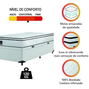 REVESTIMENTO INTERIOR: Molas ensacadas de qualidade que permitem que o colchão suporte até 120kg por pessoa, oferecendo conforto e estabilidade durante o sono