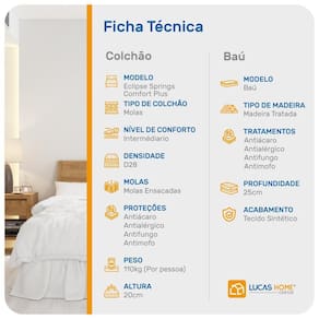 A base baú é confeccionada com madeira de reflorestamento, possuindo tratamentos anticupim e antimofo, com acabamento em material Sintético de alta qualidade. O seu diferencial é seu compartimento interno garantindo um novo espaço em seu quarto agregando valor e sofisticação ao ambiente.