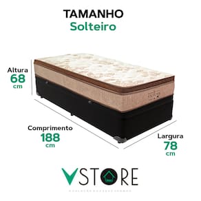A tecnologia que a sua casa merece está na V-Store! O colchão Victory Solteiro da V-Store oferece noites de sono tranquilas e confortáveis, com seu toque macio e sistema de molas ensacadas que garantem suporte ideal e independência de movimentos. O Pillow Euro Pillow proporciona ainda mais suavidade, enquanto a tecnologia EPS adiciona resistência e durabilidade. Com proteções contra ácaros, fungos, mofo e alergias, ele garante um ambiente de sono saudável. Suporta até 150 kg por pessoa e tem garantia de 12 meses.A Base Box Baú Bravus da V-Store combina praticidade e sofisticação, com madeira reflorestada e revestimento sintético que facilitam a manutenção. Seu design otimiza o espaço de armazenamento e oferece resistência, suportando até 150 kg por pessoa. Com 44 cm de altura total e Selo Ecologicamente Correto, ela é ideal para quem busca sustentabilidade e qualidade. Transforme seu quarto com o colchão Victory e a Base Box Baú Bravus da V-Store!Característica Do Colchão: Modelo: VictoryMarca: V-StoreTamanho: SolteiroDimensões: 88x30x188 (Largura x Altura x Comprimento)Conforto: MédioSistema: Molas EnsacadasPillow: Euro PillowPeso Máximo recomendado: 150 kg (Por pessoa)Proteções: Antiácaro, antialérgico, antifungo, antimofoGarantia: 12 Meses (Espuma) / 10 anos ( Conjunto de Molas Ensacadas)Característica Da Base: Marca: V-StoreModelo: BravusCor do Box: PretoTamanho: SolteiroDimensões: 88x44x188 (Largura x Altura x Comprimento)Estrutura: MadeiraPeso máximo recomendado: 150 kg (Por Pessoa)Altura do Box: 38 cmAltura dos Pés: 6 cmAltura total: 44 cmGarantia: 12 Meses (Estrutura) / 3 meses (Tecido)Selo Ecologicamente CorretoAtenção:- Antes de finalizar sua compra, recomendamos que verifique se as dimensões do produto são adequadas para serem transportadas pelos elevadores, portas, escadas e corredores de sua residência. Ressaltamos que não nos responsabilizamos pelo transporte do produto por meios específicos, como escadas, guinchos ou içamentos.- É possível que hajam leves variações de cor de acordo com o dispositivo que está sendo utilizado como smartphones, computadores, monitores e outros.