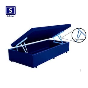 A Cama Box Baú A Colchões sintético azul solteiro possui abertura frontal do baú nas medidas de casal. As medidas de solteiro possuem abertura do baú pela lateral