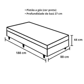 Cama Box Baú Solteiro O Box Baú Solteiro tem um sistema de fácil abertura por pistões a Gás . Proporciona para o seu quarto melhor aproveitamento de espaço, pois seu amplo baú interno é ideal para guardar objetos, roupas de cama, travesseiros, edredons, etc. Características: – Estrutura Externa: Suede– Cor Predominante: Bege– Material da estrutura: Madeira– Lateral da estrutura: Vazada– Altura do baú: 38 cm– Altura total do baú com pés: 44 cm– Largura: 88 cm– Comprimento: 188 cm– Profundidade Interna: 27 cm– Peso: 34 Kg– Altura dos Pés: 6 cm– Pistão a Gás: Sim, na cor preta– Tratamento Antiácaro: Sim– Tratamento Antialérgico: Sim– Suporta até (kg): 150 Kg– Garantia do Fornecedor: 03 meses– Necessita Montagem: Não– Acompanha colchão: Não– Acessórios: 2 puxadores e 1 arco na parte de trás para o colchão não escorregar Importante: – Verifique se o local de entrega está apto a receber o produto com as dimensões informadas.– Não nos responsabilizamos pelo transporte dos produtos por escadas, guinchos, içamentos etc. Foto meramente ilustrativa.As cores podem variar de acordo com as luzes e tela do computador, celular etc.