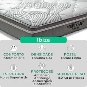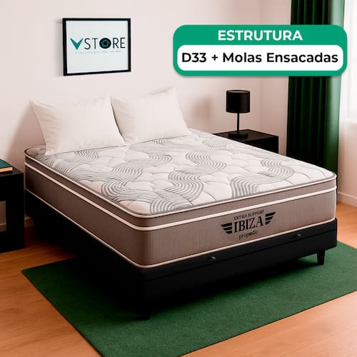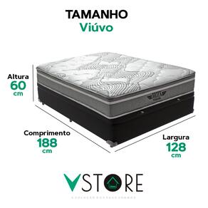 A tecnologia que a sua casa merece está na V-Store! O colchão Ibiza combina Molas Ensacadas, espuma de alta performance e sistema EPS, oferecendo suporte, conforto térmico e design moderno para noites revigorantes. Já a Base Box Baú Bravus une funcionalidade e elegância, com estrutura resistente, revestimento em tecido sintético e amplo espaço para armazenamento, ideal para otimizar o quarto com estilo..Característica Do Colchão: Modelo: IbizaMarca: V-StoreTamanho: ViúvoDimensões: 128x22x188 (Largura x Altura x Comprimento)Conforto: intermediárioSistema: Molas EnsacadasPillow: Não se aplicaPeso Máximo recomendado: 150 kg (Por pessoa)Proteções: Antiácaro, antialérgico, antifungo, antimofoGarantia: 12 Meses (Espuma) / 10 anos ( Conjunto de Molas Ensacadas)Característica Da Base: Marca: V-StoreModelo: BravusTamanho: ViúvoDimensões: 128x44x188 (Largura x Altura x Comprimento)Estrutura: MadeiraPeso máximo recomendado: 150 kg (Por Pessoa)Altura do Box: 38 cmAltura dos Pés: 6 cmAltura total: 44 cmGarantia: 12 Meses (Estrutura) / 3 meses (Tecido)Selo Ecologicamente CorretoAtenção:- Antes de finalizar sua compra, recomendamos que verifique se as dimensões do produto são adequadas para serem transportadas pelos elevadores, portas, escadas e corredores de sua residência. Ressaltamos que não nos responsabilizamos pelo transporte do produto por meios específicos, como escadas, guinchos ou içamentos.- É possível que hajam leves variações de cor de acordo com o dispositivo que está sendo utilizado como smartphones, computadores, monitores e outros.