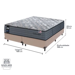 Bem-vindo(a) ao nosso catálogo! Apresentamos a você uma descrição completa sobre esse produto: A marca SealyEntre as personalidades que usam e usaram os colchões da marca Sealy estão a cantora Adele, Rainha Elizabeth II, a apresentadora Ellen DeGeneres e o jogador de basquete LeBron James. Atendendo também os hotéis da Disney, Copacabana Palace, Hard Rock Hotels e outros. Referência na fabricação de colchões de alta qualidade, a empresa foi fundada em 1881. Investindo em tecnologia de ponta e materiais premium para produzir produtos duráveis e confortáveis, é reconhecida por diversos consumidores famosos em todo o mundo. Modelo: LincolnNível de Conforto: MacioSuporte de peso: 300 quilos (150kg por pessoa)Molas: Molas Ensacadas DSS Espuma: Espuma Hipersoft GelAltura: 33 cm Tecido: Malha Margan 365 gO Colchão Lincoln Sealy é o ápice do conforto e sofisticação, criado para quem busca o melhor em qualidade de sono. Este colchão de 33 cm de altura é uma verdadeira obra-prima, combinando a renomada tecnologia de Molas Ensacadas DSS com o suporte adicional da tecnologia Posturepedic. Essa combinação oferece um alinhamento perfeito da coluna e alívio dos pontos de pressão, proporcionando uma experiência de sono revitalizante e tranquila. Com uma camada de espuma Hipersoft Gel, o Colchão Lincoln Sealy eleva o conforto a um novo patamar, garantindo uma sensação de maciez e ajudando a dissipar o calor, mantendo a temperatura ideal durante toda a noite. O tampo em Malha Margan, com 365 g/m², adiciona um toque de frescor e elegância, enquanto a lateral em Jacquard Plano reforça a durabilidade e o visual sofisticado. Além disso, o colchão é equipado com uma camada adicional de fibra siliconada e espuma Soft, com um reforço estratégico no terço central, garantindo suporte extra e conforto incomparável. As bordas firmes ampliam a área útil do colchão, evitando deformações e garantindo que cada centímetro seja aproveitado ao máximo. Com capacidade de suporte de até 150 kg por pessoa, o Colchão Lincoln Sealy não é apenas sinônimo de conforto, mas também de durabilidade e resistência. Eleve sua experiência de sono com este colchão, que combina tecnologia avançada, materiais de alta qualidade e um design elegante, transformando suas noites em momentos de descanso verdadeiramente restauradores. Além de tudo, esse produto acompanha a Cama Box da Kaza Mix e assim se torna um conjunto perfeito para o seu quarto! Marca: Kaza MixCor do Box: BegeTamanho: QueenMaterial dos pés: MadeiraEstrutura: MadeiraPeso máximo recomendado: Até 150kg de cada ladoLargura: 158cmComprimento: 198cmAltura dos pés: 12cmAltura total: 42cmGarantia: 03 mesesSelo Ecologicamente CorretoAtenção: - Antes de finalizar sua compra, recomendamos que verifique se as dimensões do produto são adequadas para serem transportadas pelos elevadores, portas, escadas e corredores de sua residência. Ressaltamos que não nos responsabilizamos pelo transporte do produto por meios específicos, como escadas, guinchos ou içamentos. - É possível que hajam leves variações de cor de acordo com o dispositivo que está sendo utilizado como smartphones, computadores, monitores e outros.