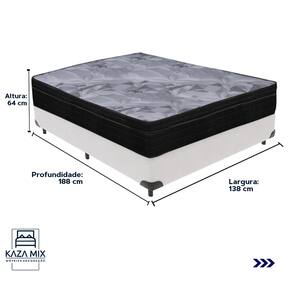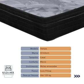 O conforto que sua casa precisa e a qualidade que você merece está na Kazamix!Redefina suas noites de sono com o Colchão Pampa Molas Ensacadas, projetado para oferecer máximo conforto e suporte. Suas molas ensacadas individualmente garantem estabilidade, minimizando vibrações e proporcionando um descanso tranquilo. O Ortopillow com tecido em poliéster de alta resistência e bordado matelassê acrescenta uma camada extra de maciez e conforto. Com tratamento antiácaro, antifungo e tecnologia No Turn, é ideal para quem busca praticidade e um ambiente de sono mais saudável. Este colchão combina qualidade e durabilidade para oferecer uma experiência de descanso incomparável.Modelo: Pampa Marca: OrtobomTamanho: CasalDimensões: 138x188X24 (Largura x Comprimento x Altura)Conforto: MacioSistema: Molas ensacadas Pillow: Euro PillowPeso Máximo recomendado: 120 kg (Por pessoa)Proteções: Antiácaro, antialérgico, antifungo, antimofoGarantia: 1 ano pelo FabricanteO conforto que sua casa precisa e a qualidade que você merece está na Kazamix!Eleve o conforto e a sofisticação do seu quarto com a Cama Box!Produzida em madeira de reflorestamento reforçada, a Cama Box combina qualidade, durabilidade e um design elegante, que confere leveza e modernidade ao seu dormitório. Sua estrutura robusta suporta até 150 kg por pessoa, garantindo a sustentação perfeita para o colchão e prolongando a vida útil do produto.Com uma altura ergonômica, ela oferece maior conforto ao deitar e levantar, enquanto o acabamento de alta qualidade se adapta a qualquer estilo de decoração, unindo praticidade e estilo.Não perca tempo! Adquira agora mesmo a sua Cama Box e transforme seu dormitório com conforto e elegância.Marca: KazaMixModelo: BoxCor do Box: BrancoTamanho: CasalDimensões: 138X188X35 (Largura x Comprimento x Altura) Estrutura: MadeiraPeso máximo recomendado: 150 kg (Por Pessoa)Altura do Box: 25 cm Altura dos Pés: 10 cm Altura total: 35 cm Garantia: 03 mesesSelo Ecologicamente CorretoAtenção: Antes de finalizar sua compra, certifique-se de que as dimensões do produto sejam adequadas para serem transportadas pelos elevadores, portas, escadas e corredores de sua residência. Ressaltamos que não nos responsabilizamos pelo transporte do produto por meios específicos, como escadas, guinchos ou içamentos.