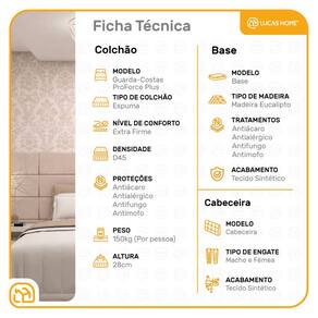 A base box é confeccionada com madeira de reflorestamento, tratamentos anticupim e antimofo. Seu revestimento de alta qualidade agrega valor e sofisticação ao quarto. O Colchão Guarda-Costas ProForce Plus da Probel é produzido com espuma D45, tampo e laterais em poliéster. Possui Pillow Top, que dá maciez extra e a tecnologia ONE FACE possibilitando que o colchão não seja virado, que oferece mais tempo útil de uso. O produto tem um conforto extra firme, adequado para que suas costas ao deitar-se, não sejam prejudicadas.