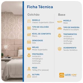 Sejam bem-vindos (as) a LUCAS HOME, além de conforto e uma excelente noite de sono, trazemos para você a qualidade e a sofisticação que faltava em seu quarto. A cabeceira Cassis é produzida com madeira de eucalipto e espuma D12. Possui um acabamento de alta qualidade deixando o seu ambiente mais sofisticado e despojado, dando aquele conforto na hora de ver filmes, séries e ler uma revista ou um bom livro. A base box é confeccionada com madeira de reflorestamento, tratamentos anticupim e antimofo. Seu revestimento de alta qualidade agrega valor e sofisticação ao quarto. O colchão de molas de fios contínuos Classic Superlastic proporciona conforto e maciez. O seu bordado em Matelassê te dá alívio extra na hora de deitar.