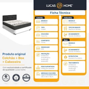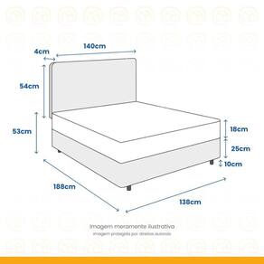 Especificações Técnicas Base Box: - Marca: Lucas Home; - Material: Madeira tratada; - Peso máximo recomendado: até 120 Kg (por pessoa); - Altura da base: 25cm; - Altura dos pés: 10cm; - Revestimento: Material Sintético; - Garantia: 12 meses; - Dimensões do produto (largura x comprimento x altura) 138x188x35cm;