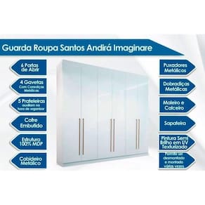 Dimensões(Cm): Comnto(Profundidade): 46,3cm x Largura: 238,8cm x Altura: 219cm Material de Estrutura - Estrutura 100% MDP Tipo de Pintura - Ultravioleta - Texturizada Tipo de Acabamento da Pintura - Semi Brilho Diferenciais Guarda Roupas - Calceiro - Sapateira - Maleiro Material dos Cabideiros - Cabideira Metálico Tipo de Dobradiças - Dobradiças Metálicas Diferenciais das Portas - Cofre Embutido Quantidade de Portas - 6 Portas de Abrir Tipo de Corrediça - c/ Corrediças Metálicas Quantidade de Gavetas - 4 Gavetas Quantidade de Prateleiras - 5 Montagem do Produto - Desmontável Garantia - 3 meses