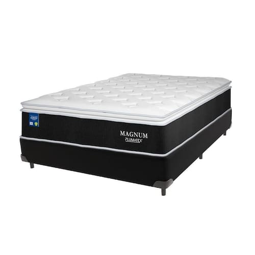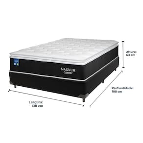 Colchão: Modelo: Magnum; Marca: Plumatex; Tamanho: Casal; Dimensões: 138x188x18cm; (largura x comprimento x altura) Conforto: Molas Ensacadas, Espuma D26, Pillow Top High Tech; Proteções: Antiácaro, antialérgico, antifungo, antimofo; Possui: Malha Chronos 180 g/m; Peso máximo recomendado: até 110Kg (por pessoa); Garantia: 03 meses;