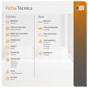 Tipo de molas: Molas ensacadas, sao elas responsaveis para garantir uma excelente noite de sono, elas sao um saco de molas que trabalham de maneira individualmente, sao independentes umas das outras, assim garante a longevidade da vida util do colchao, pois quando uma pessoa se deita quase nao afeta com o movimento ondular proporcionado, proporcionando assim tambem um conforto muito grande.
