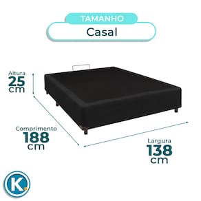 Base box Casal ideal para otimizar o espaço do quarto com praticidadeRevestimento em Material Sintético : fácil de limpar e com visual modernoCompatível com colchões de 138x188cm, padrão solteiro nacionalFicha Técnica Cama Box:Modelo: UniversalMarca: NatureTamanho: CasalTecido: Material Sintético Largura: 138cmComprimento: 188cmAltura: 25cmAltura dos Pés: 13cmMaterial dos Pés: MadeiraSuporte de Peso: 150KgPeso: 27KgGarantia: 3 MesesAtenção:Antes da compra certifique-se de que o produto passa por elevadores, portas e corredores.As transportadoras não realizam entregas por escadas ou içamentos.Caso o item não caiba no elevador, a entrega será considerada concluída no térreo do prédio.A cor e tonalidade do produto pode variar de acordo com o dispositivo que o usuário está acessando.