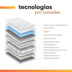 MOLEJO: Sistema Max Force Pro, tecnologia de molas de alta performance que oferece suporte avançado e firmeza progressiva, se adaptando ao peso e aos movimentos do corpo para um descanso estável e confortável.