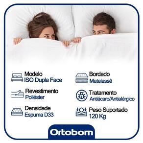 O Colchão Ortobom Colchão Iso Duplo Conforto é a da Ortobom entre os colchões mistos. De um lado possui o seu lado macio com suporte e camada de conforto em espuma D28 Pró Aditivada de Alta Performance, Ideal para pessoas com até 80 quilos. Do outro lado possui o seu lado firme com suporte e camada de conforto em espuma D33 Pró Aditivada de Alta Performance, Ideal para pessoas com até 100 quilos. O tampo é bordado em Matelassê, que uma camada extra de conforto. Seu revestimento é em Poliéster com tratamento e .