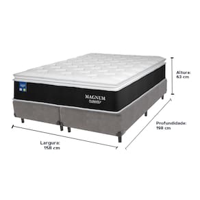 O conforto que sua casa precisa e a qualidade que você merece está na Kazamix!Descubra o colchão Magnum da Plumatex, a escolha ideal para quem busca conforto, suporte e qualidade. Com tecnologia avançada, o Magnum combina o melhor em materiais e design para proporcionar uma experiência de sono única.O colchão conta com uma camada de Malha Chronos 180 g/m², que oferece um toque macio e agradável. As Molas Ensacadas garantem suporte personalizado e distribuem o peso de forma uniforme, minimizando a transferência de movimento. A Espuma D26 oferece firmeza e conforto duradouro, enquanto o EPS Pillow Top Hig|h Tech adiciona um toque luxuoso, elevando ainda mais a experiência de descanso.Com proteção antiácaro, antialérgico e antifungo, o Magnum assegura um ambiente saudável para o seu sono. Ideal para quem deseja um colchão durável e de alta performance.Invista no seu bem-estar e experimente o conforto excepcional do Magnum.Modelo: MagnumMarca: PlumatexTamanho: QueenDimensões: 158x198X28 (Largura x Comprimento x Altura)Conforto: IntermediárioSistema: Molas EnsacadasPillow: Pillow TopPeso Máximo recomendado: 110 kg (Por pessoa)Proteções: Antiácaro, antialérgico, antifungo, antimofoGarantia: 1 ano pelo FabricanteO conforto que sua casa precisa e a qualidade que você merece está na Kazamix!Eleve o conforto e a sofisticação do seu quarto com a Cama Box!Produzida em madeira de reflorestamento reforçada, a Cama Box combina qualidade, durabilidade e um design elegante, que confere leveza e modernidade ao seu dormitório. Sua estrutura robusta suporta até 150 kg por pessoa, garantindo a sustentação perfeita para o colchão e prolongando a vida útil do produto.Com uma altura ergonômica, ela oferece maior conforto ao deitar e levantar, enquanto o acabamento de alta qualidade se adapta a qualquer estilo de decoração, unindo praticidade e estilo.Não perca tempo! Adquira agora mesmo a sua Cama Box e transforme seu dormitório com conforto e elegância.Marca: KazaMixModelo: BoxCor do Box: CinzaTamanho: QueenDimensões: 158X198X35 (Largura x Comprimento x Altura) Estrutura: MadeiraPeso máximo recomendado: 150 kg (Por Pessoa)Altura do Box: 25 cm Altura dos Pés: 10 cm Altura total: 35 cm Garantia: 03 mesesSelo Ecologicamente CorretoAtenção: Antes de finalizar sua compra, certifique-se de que as dimensões do produto sejam adequadas para serem transportadas pelos elevadores, portas, escadas e corredores de sua residência. Ressaltamos que não nos responsabilizamos pelo transporte do produto por meios específicos, como escadas, guinchos ou içamentos.