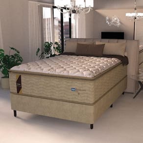 REVESTIMENTO SUPERIOR: Pillow top macio, tecido em malha branca com detalhes em bege que permite melhor ventilação, possui pillow super que é uma camada extra de conforto.