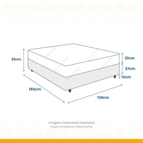 Especificações Técnicas Colchão: - Tipo de Mola: Ensacada; - Proteções: Antiácaro - Antialérgico - Antifungo - Antimofo; - Acabamento: Bordado em Matelassê; - Matéria-prima: Espuma/Molas/Tecido; - Tipo de conforto: Macio; - Peso máximo recomendado: até 120kg (por pessoa); - Garantia: 12 meses; - Dimensões do produto (largura x comprimento x altura) 138x188x22cm;