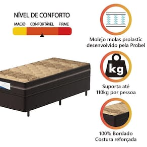 MEDIDAS:: [ A ] = 62 cm / 50 cm (Sem pés) [ L ] = 88 cm [ P ] = 188 cm | ALTURA DOS PÉS:: 12 cm | PESO:: 30,32kg | PESO SUPORTADO:: 110kg por pessoa | MODELO:: PELMEX | MARCA DO COLCHÃO:: Probel | MARCA DO BOX:: Prince | COR:: Marrom / Bege | REVESTIMENTO SUPERIOR:: Tecido em poliéster que permite melhor ventilação, proporcionando conforto e sensação agradável ao toque. | TECIDO LATERAL:: Poliéster marrom, por ser sintético não é propenso ao acúmulo de poeira e materiais orgânicos, além de ser de fácil higienização. | REVESTIMENTO INTERIOR:: Molejo estrutural em molas prolastic, que permitem que o colchão suporte até 110kg por pessoa, oferecendo conforto e estabilidade durante o sono. | REVESTIMENTO INFERIOR:: Tecido antiderrapante | ANTI ALÉRGICO / ÁCARO:: Sim | PILLOW EURO:: Sim | ESPUMA:: D28 | POSSUI EPS:: Sim | TECIDO DO BOX:: Suede | PÉS:: 6 | MATERIAL DOS PÉS:: Plástico | ITENS INCLS:: 1 Colchão de 0,88m e 1 Box de 0,88m | GARANTIA DO COLCHÃO:: 12 Meses pelo Fabricante | GARANTIA DO BOX:: 3 Meses pelo Fabricante | AVISO:: A Esplanada Móveis se responsabiliza pela entrega dos produtos adquiridos até a porta de entrada ou portaria do endereço indicado, se a portaria do condomínio permitir, as entregas são efetuadas no piso térreo e é de responsabilidade do cliente | TAMANHO: Solteiro Cor: Marrom/Beg