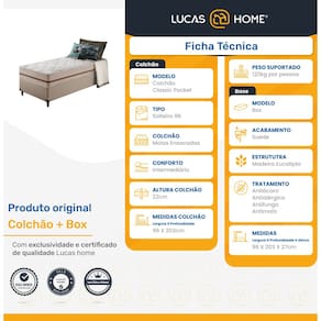 Sejam bem-vindos(as) a Lucas Home! Pensando em melhorar suas noites de sono?A cama Box + Colchão Classic Molas é a escolha ideal! Fabricado com matéria-prima de qualidade, ele suporta até 120kg por pessoa, proporcionando conforto médio, o que lhe confere conforto extra durante o sono sem comprometer sua coluna. A Cama Box é fabricada em madeira de reflorestamento, suporta até 100Kg e seus pés em madeira são de 12cm. Possui revestimento em suede nas laterais, o produto que faltava em seu dormitório.