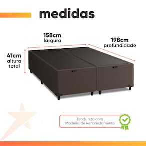 A Cama Box Bipartido com Baú possui um sistema de abertura fácil, onde você terá mais espaço para poder você guarda os seus objetos pessoais, roupas, camas, travesseiro, edredons. Trará para o seu quarto um melhor aproveitamento de espaço. MODELO: Box com Baú Queen 1,58m MARCA: Prince COR: Marrom MEDIDAS: A: 38 cm / 26 cm (sem pés) L: 158 cm P: 198 cm TECIDO: Suede PESO: 84,2kg PÉS: 12 cm MATERIAL DOS PÉS: Plástico ITENS INCLUSOS: 2 Box de 0,79m