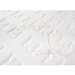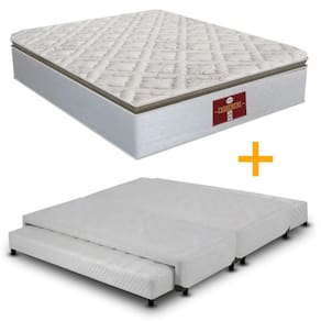 A Cama box + Colchão Cashmere QUEEN SIZE Pillow - Mola Ensacada - 158x198 é ideal para quem busca um Conforto Macio e um toque suave com um tecido em malha de algodão e viscose que mantém a temperatura do Colchão sempre agradável. Molejo ensacado que elimina a sensação de balanço do colchão e também proporciona o ajuste correto à coluna, permitindo que o corpo afunde somente onde precisa afundar dando total apoio à região lombar. A borda de espuma de alta densidade (Polyframe) oferece maior firmeza nas laterais do colchão impossibilitando a formação de barriga nessas regiões. Para biótipos com até 120 Kg. Selo de qualidade Pró Coluna Gold.