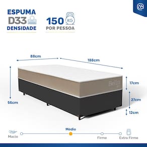 Espuma D33 (colchão), Madeira tratada (base box), Tecido sintético (revestimento base box)Vendido e entregue por LUCAS HOME NORDESTE